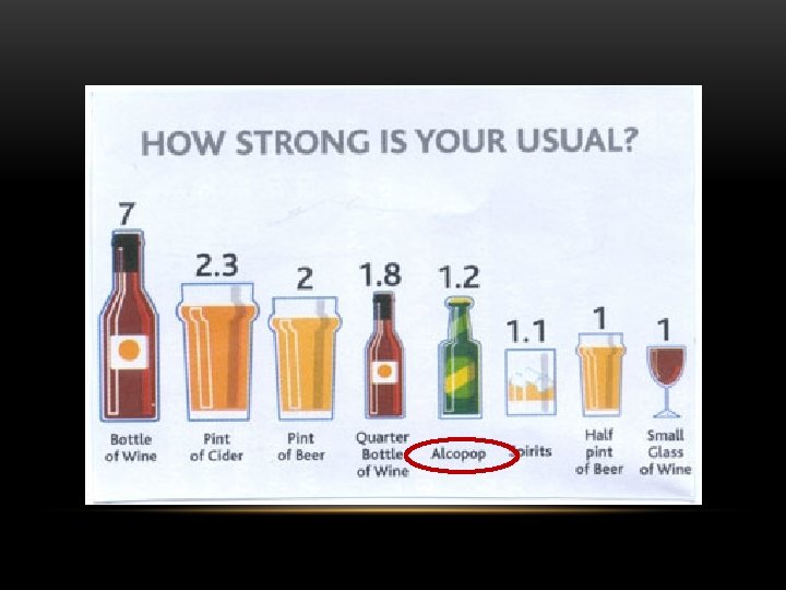 SCREENING FOR ALCOHOL ABUSE • CAGE Questionnaire 1. Have you ever felt you should CUT down on your drinking? 2. Have people ANNOYED you by criticizing your drinking? 3. Have you ever felt GUILTY about your drinking? 4. Have you ever had a drink first thing in the morning to steady your nerves or to get rid of a hangover (EYE-OPENER)? • (EACH REPSONSE 0 OR 1 → ≥ 2 IS SIGNIFICANT) • Sensitivity of 71% and specificity of 90%