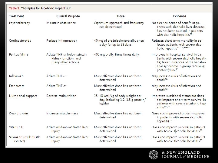 TREATMENT- STEROIDS • MDF ≥ 32 +/- HE without contraindications • Prednisolone 40 mg/day for 4 weeks then tapered over 2 -4 weeks • Recent study in NEJM on NAC + prednisolone • If steroids contraindicated, consider pentoxifylline therapy