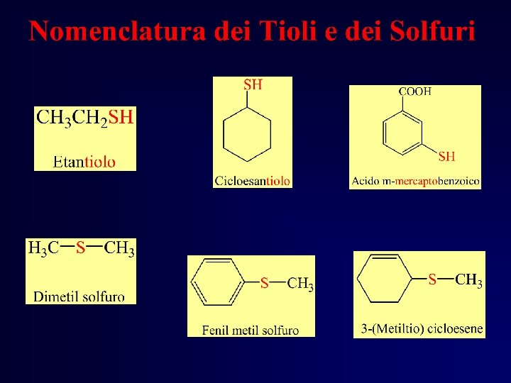 Alcoli, Fenoli, Tioli, Eteri • Considerare ciascuna catena carboniosa come un gruppo alchilico (desinenza –il). • Aggiungere la parola Etere.