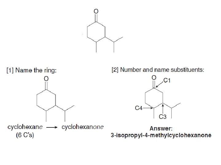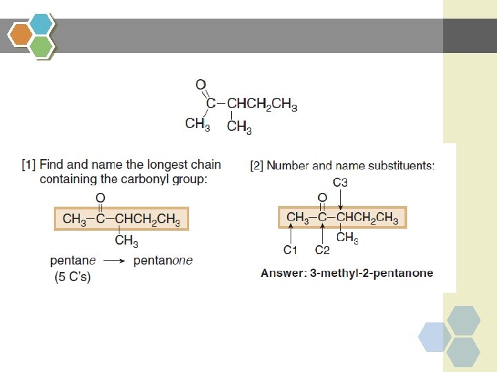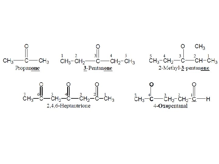 Naming Ketones in the IUPAC System Ø To name an acyclic ketone using IUPAC rules: [1] Find the longest chain containing the carbonyl group, and change the -e ending of the parent alkane to the suffix -one. [2] Number the carbon chain to give the carbonyl carbon the lower number. Apply all of the other usual rules of nomenclature.