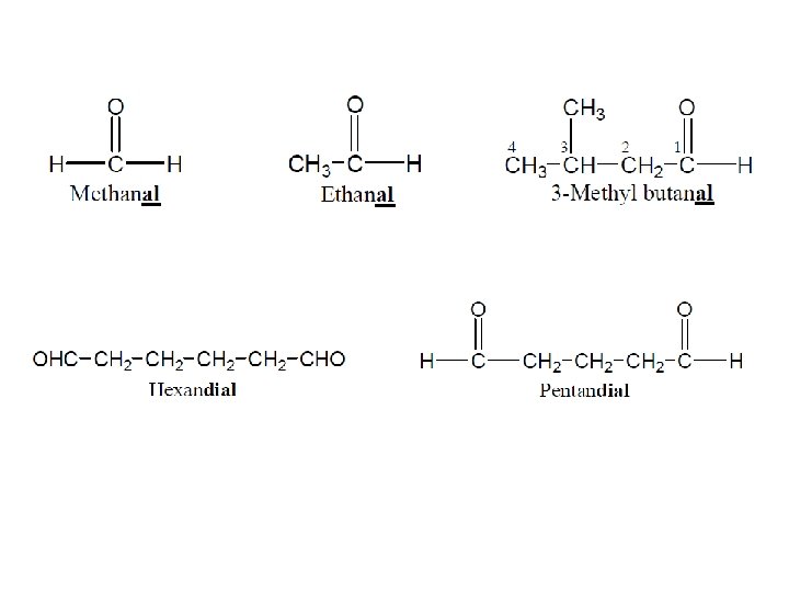 Nomenclature Both IUPAC and common names are used for aldehydes and ketones. Ø Naming Aldehydes in the IUPAC System To name an aldehyde using the IUPAC system: [1] If the CHO is bonded to a chain of carbons, find the longest chain containing the CHO group, and change the -e ending of the parent alkane to the suffix -al. If the CHO group is bonded to a ring, name the ring and add the suffix -carbaldehyde. [2] Number the chain or ring to put the CHO group at C 1