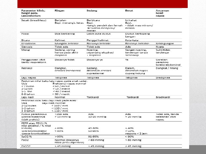 TATA LAKSANA Serangan Asma Berat u Aminofilin diberikan secara intravena. Jika belum pernah mendapat aminofilin diberikan dosis awal 6 -8 mg/kgbb dilarutkan dalam D 5% 20 cc diberikan selama 20 -30 menit u Jika telah mendapat aminofilin sebelumnya (kurang dari 4 jam), dosis diberikan adalah setengah dosis u Aminofilin dosis rumatan diberikan sebesar 0, 5 -1 mg/kgbb/jam u Jika ada perbaikan, nebulisasi diteruskan tiap 6 jam u Steroid dan aminofilin diganti oral u Jika dalam 24 jam pasien tetap stabil, pasien dapat dipulangkan dengan obat β-agonis yang diberikan tiap 4 -6 jam selama 24 -48 jam. u Steroid oral dilanjutkan u Ancaman henti napas ; hipoksemia (kadar Pa. O 2 < 60 mm. Hg dan atau Pa. CO 2>45 mm. Hg). Pada ancaman henti napas diperlukan ventilasi mekanik