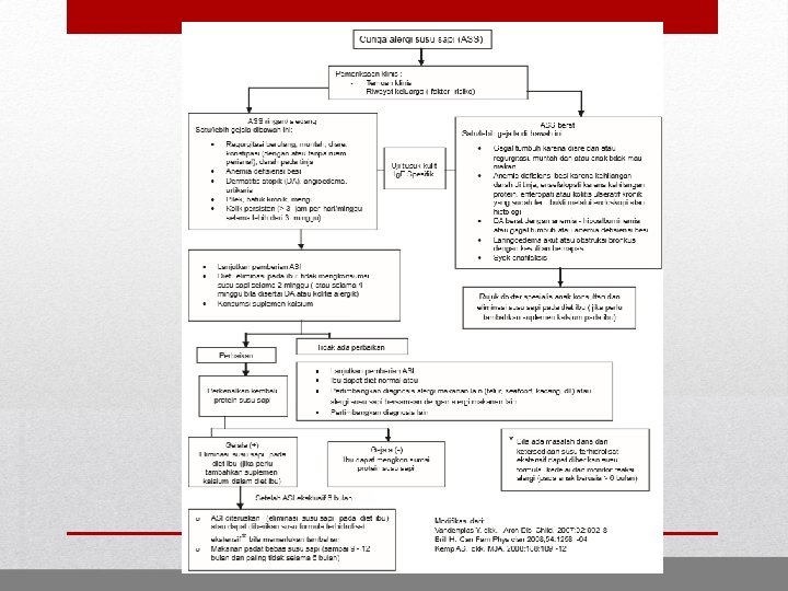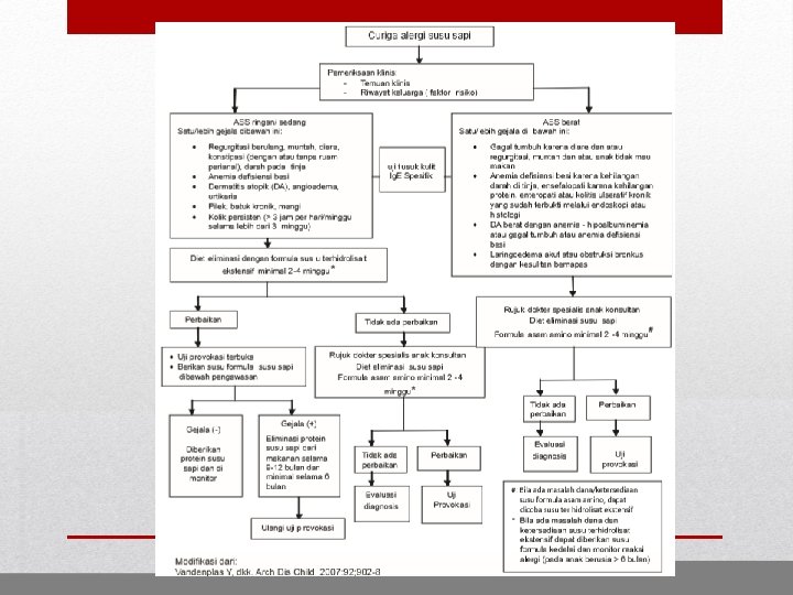 TATA LAKSANA Nutrisi u Prinsip utama : menghindari segala bentuk produk susu sapi u Bayi dengan ASI eksklusif yang ASS : dapat menjutkan ASI dengan menghindari protein susu sapi dan produk turunannya pada makanan sehari-hari u Bayi yang mengknsumsi susu formula u Susu hipoalergenik : susu terhidrolisat ekstensif dan asam amino u Susu terhirdrolisat parsial bukan merupakan pilihan umtuk terapi u Eliminasi dilakukan sampai bayi berusia 9 atau 12 bulan atau paling tidak selama 6 bulan u Jika tidak tersedia atau terdapat kendala biaya : susu formula yang mengandung isolat protein kedelai