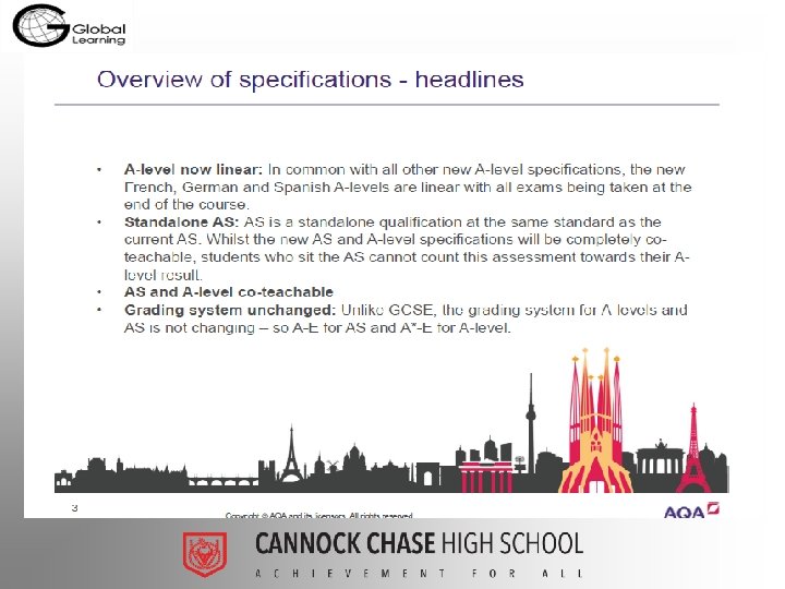 Aims of the Course • develop an interest in, and enthusiasm for, language learning • develop understanding of the language in a variety of contexts and genres • communicate confidently, clearly and effectively in the language for a range of purposes • develop awareness and understanding of the contemporary society, • cultural background and heritage of countries or communities where the language is spoken • consider their study of the language in a broader context