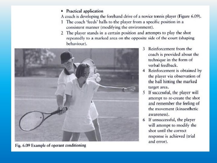 Operant Conditioning (cont. ) Strengthening the SR bond � Positive reinforcement- praise or rewards � Early success- Coach should set easy targets to ensure initial success (develops confidence) � Mental rehearsal- Going over performance helps develop an automatic response � Task as a whole- Coach should allow performer to practice skill as a whole to develop understanding � Negative reinforcement- withdrawal of praise which had previously been given � Punishment- Use carefully to avoid lowering confidence/motivation (fine, dropped from team or made to do extra training)