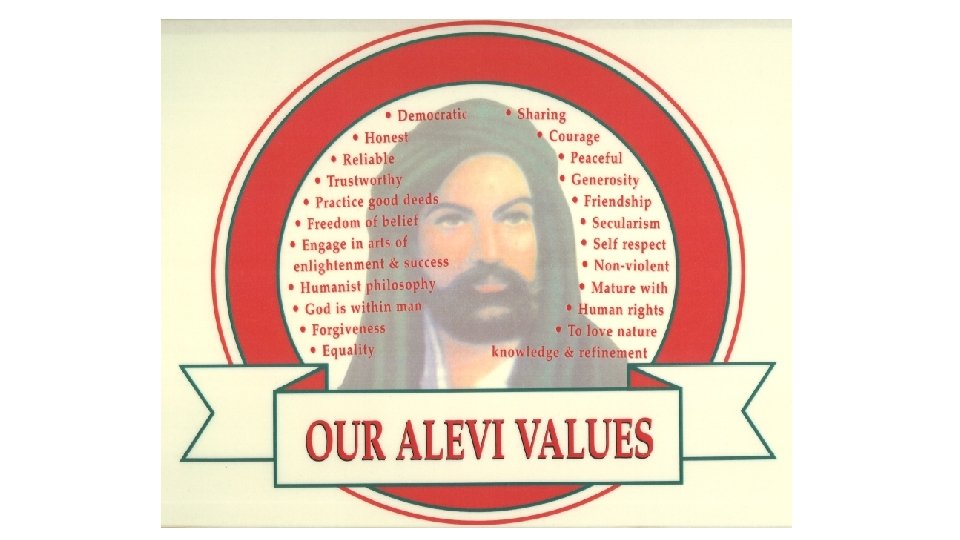 These are key Alevi values • • • Democracy Honesty Trustworthiness Practice good deeds Freedom of belief Humanist philosophy God within us all Forgiveness Equality Engage in arts of enlightenment and success • • • Sharing Courage Peace Generosity Friendship Secularism Self-respect Non-violence Mature in faith/spirit Human rights To love nature, knowledge and refinement