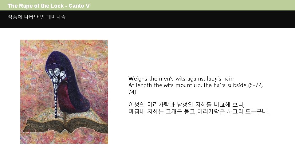 The Rape of the Lock - Canto V 작품에 나타난 반 페미니즘 And she who scorns a man must die a maid; What then remains but well our power to use, And keep good humor still whate’er we lose? (5 -28 -30) 남성을 거부하는 여자는 평생을 홀로 살아야 한다네, 하찮은 일들 익살로써 대하노라면, 우리가 잃을 것이 무엇이 있겠는가?
