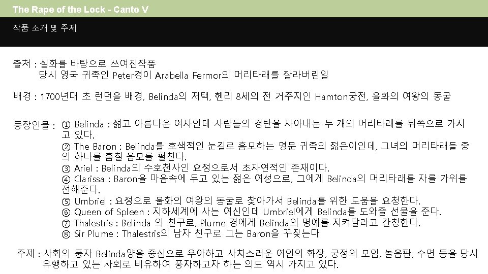 ALEXANDER POPE The Rape of the Lock : An Heroicomical Poem - Canto V 번역과 작품에 나타난 반 페미니즘요소 1151168 최원준