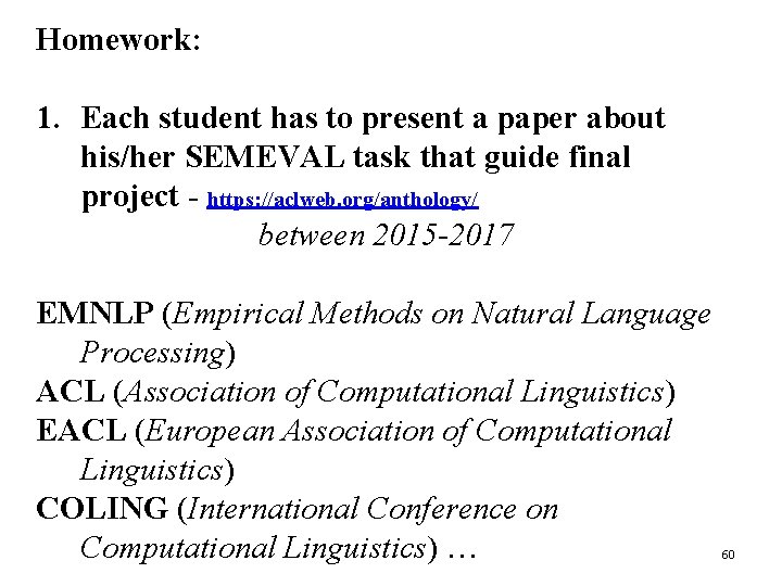 Homework: 1. Each student has to present a paper about his/her SEMEVAL task that guide final project - https: //aclweb. org/anthology/ between 2015 -2017 EMNLP (Empirical Methods on Natural Language Processing) ACL (Association of Computational Linguistics) EACL (European Association of Computational Linguistics) COLING (International Conference on Computational Linguistics) … 60
