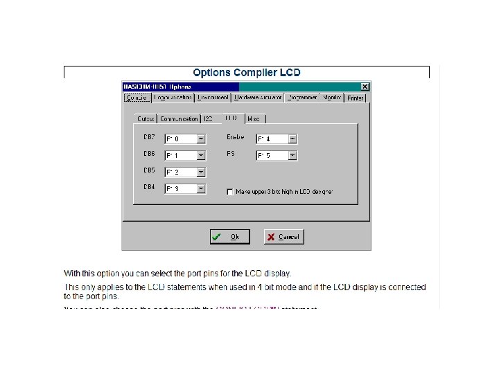 Zadatak: Napisati zadani kôd te isprobati na simulatoru unutar BASCOM razvojnog okruženja! Config Lcd = 16 * 2 Config Lcdbus = 4 Dim I As Byte Dim S As String * 9 Dim S 1 As String * 9 S = "Dobar dan“ Cls Lcd Chr(0) Lcd "-" Waitms 100 Lcd "LCD designer" Waitms 100 Shiftlcd Right Waitms 50 For I = 1 To 10 Shiftlcd Right Waitms 50 next I Rezultat: For I = 1 To 10 Shiftlcd Left Waitms 50 Next I Home Lowerline For I = 1 To 9 S 1 = Mid(s , I , 1) Lcd S 1 Waitms 100 Next I Lcd "-" Lcd Chr(0) Display Off Waitms 100 Display On End Deflcdchar 0 , 31 , 4 , 31 , 21 , 32 ‘