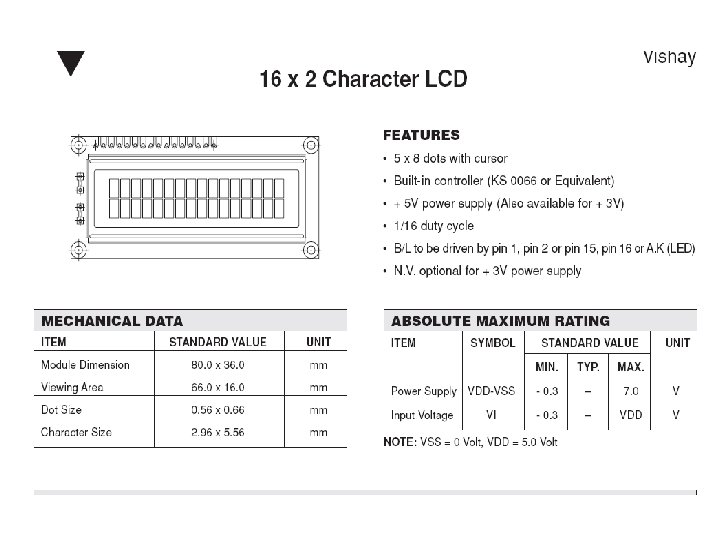 Standardne veličine displeja su : 16*2, 16*1, 16*4, 20*2, 37*4, 40*4 itd… Raspored pinova je obično isti bez obzira na model, ali to nije pravilo, položaj pinova na pločici ne mora biti uvijek isti! Uvijek je prvi pin VSS(masa) a zadnji D 7 14. pin. Većina displeja ima i dodatno 15 i 16 pin a to su anoda i katoda za LED osvjetljenje. Pinovi D 7 do D 0 su podatkovni pinovi, pin E omogućuje ispis u displej ili čitanje RAM memorije iz displeja. Pomoću RW pina određuje se da li je čitanje ili pisanje na displej. Obično je pisanje pa je RW=0 ili spojen na masu. RS pin određuje da li se obraćamo podatkovnom ili instrukcijskom registru. Kad je RS =0 onda se obraćamo intrukcijskom registru (mjesto pojavljivanja znaka, brisanje ekrana i efekti). Kad je RS=1 onda vrši se ispis znaka u DDRAM ili CGRAM. Upisom u DDRAM podaci se pojave na ekranu. CGRAM sadrži matrične točkaste prikaze znakova koji se mogu prikazati na ekranu. Sadržaj CGRAM se može mijenjati softverski i tako se definirati korisnički znakovi. 16*2 displej ima 16 vidljivih i 24 skrivena znaka (adrese):