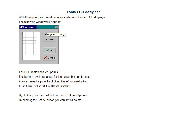 Osobnosti: LCD displejem možemo prikazati slova, brojeve, znakove interpunkcije te posebno dizajnirane znakove( obično slova s kvačicama ili neka druga pisma). Specijalizirani softver omogućujue i stvaranje fontova i znakova drugih jezika osim engleskog. BASCOM 8051 posjeduje dio koji se zove LCD DESIGNER koji nam omogućuje stvaranje posebnih znakova! Ekran je organiziran u redove i stupce. Redovi i stupci sačinjeni su od piksela a svaki piksel ima svoju adresu. To omogućuje aktiviranje piksela po želji čime možemo dobiti različite efekte ali i pisati jednostavni tekst. Glavni dio displeja je tekući kristal. On se nalazi između dva tipa staklenih eklektroda. Na jednoj strani staklene površine nalaze se segmentne elektrode. Broj segmentnih elektroda određuje i broj piksela. Adresiranje piksela vrši se sekvencijalno(DDRAM memorija i kontroler su u modulu displeja*). Kad se signal pošalje ne segmentnu elektrodu ona aktivira ili deaktivira segmenat.