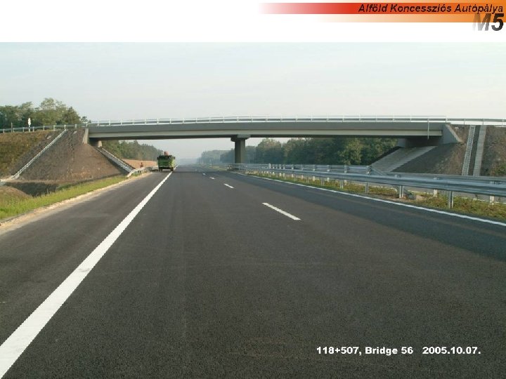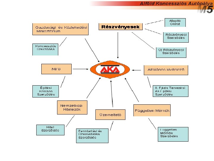 AZ M 5 AUTÓPÁLYA TÖRTÉNELME 1994. 05. - KONCESSZIÓS SZERZÕDÉS ALÁÍRÁSA koncesszió 35 évre szól; 1994. 07. -AKA Alföld Koncessziós Autópálya Rt. megalakulása; 1996. 12. -1 A szakasz átadása; 1997. 01. -Útdíjszedés megkezdése 1997. 12. -1 B szakasz átadása; 1998. 06. -1 C szakasz átadása, azaz I. fázis (Budapest - Kiskunfélegyháza) elkészülte; Projekt átalakítás; 2004. 03. 9 -12. Részvények 39, 48%-nak eladása az ÁAK Rt. -nek Közvetlen útdíj eltörlése, rendelkezésre állási díj bevezetése; II. fázis (Kiskunfélegyháza - Szeged) építési szerződésének aláírása; 2005. 03. 30. - III. fázis (Szeged - Országhatár) építési szerződésének aláírása
