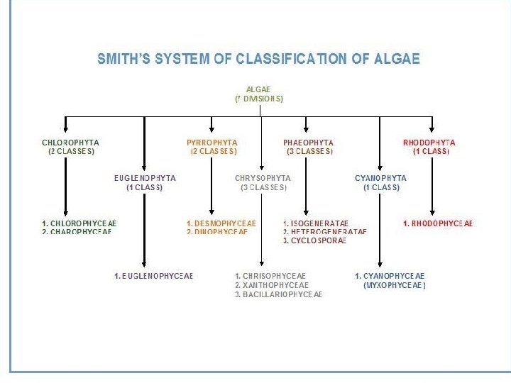 CLASSIFICATION OF ALGAE PROPOSED BY SMITH • Smith (1933, 1951, 1955) gave classification of algae on the following basis: Characters of vegetative cells. Morphology of motile reproductive cell. He divided algae into seven divisions, then classes were included in each division.