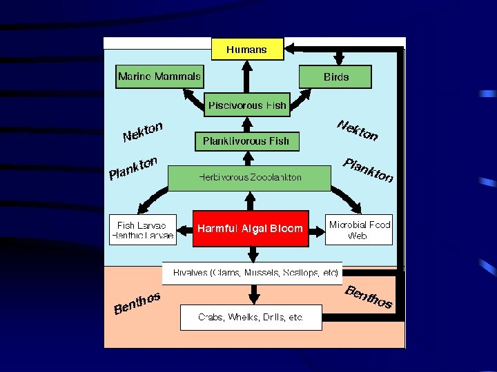 Toxic Phytoplankton & Human poisoning • • Paralytic shellfish poisoning - saxitoxin Neurotxic shellfish poisoning - brevetoxin Ciguatera fish poisoning - ciguatoxin and maitotoxin Diarrhetic shellfish poisoning - okadaic acid Amnesic shellfish poisoning - domoic acid Cyanobacterial neurotoxins - anatoxins Cyanobacterial hepatotoxins - microcystin, nodularin Dermatitis - lyngbyatoxin, aplysiatoxin