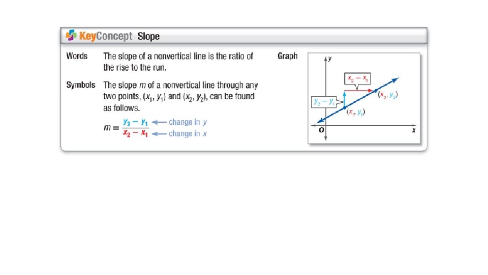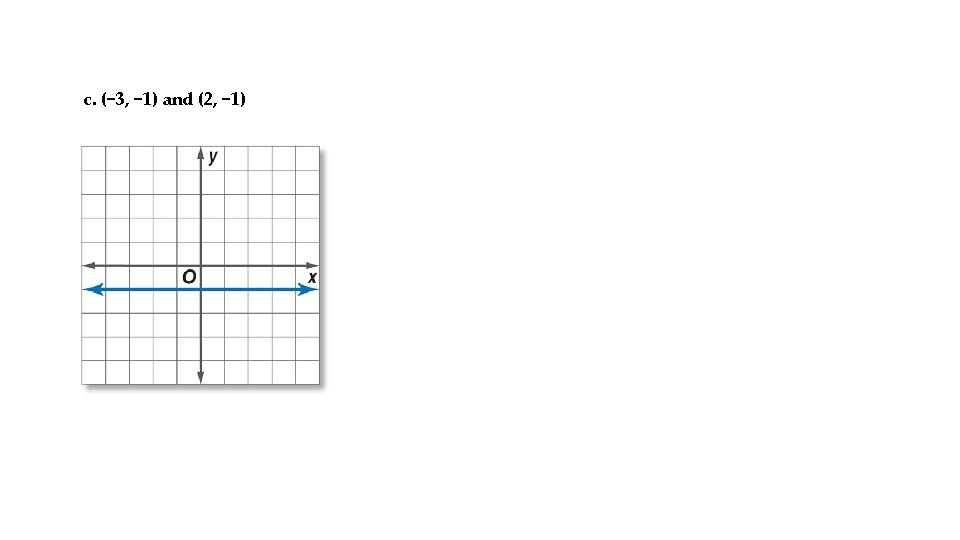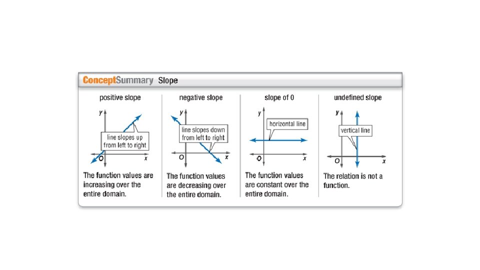 Example 5 Undefined Slope Find the slope of the line that passes through ( − 2, 4) and (− 2, − 3). Zero and Undefined Slopes If the change in y-values is 0, then the graph of the line is horizontal. If the change in x-values is 0, then the slope is undefined. This graph is a vertical line.