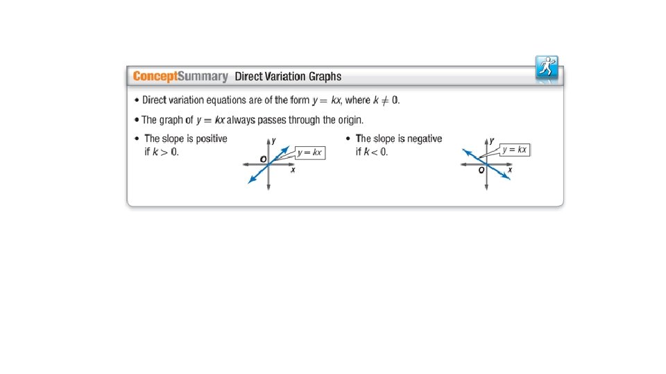 3 -4 Direct Variation 1 Direct Variation Equations A direct variation is described by an equation of the form y = kx, where k ≠ 0. The equation y = kx illustrates a constant rate of change, and k is the constant of variation, also called the constant of proportionality. Example 1 Slope and Constant of Variation Name the constant of variation for each equation. Then find the slope of the line that passes through each pair of points.