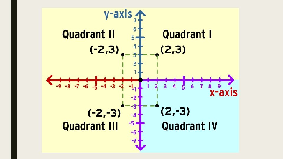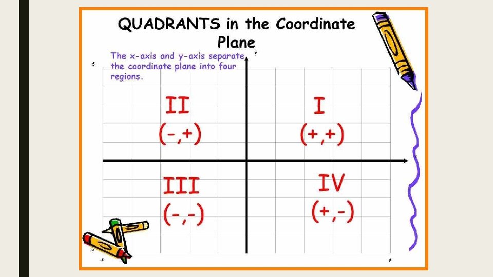 QUADRANTS ■ The intersecting x- and y-axes divide the coordinate plane into four sections. These four sections are called quadrants.
