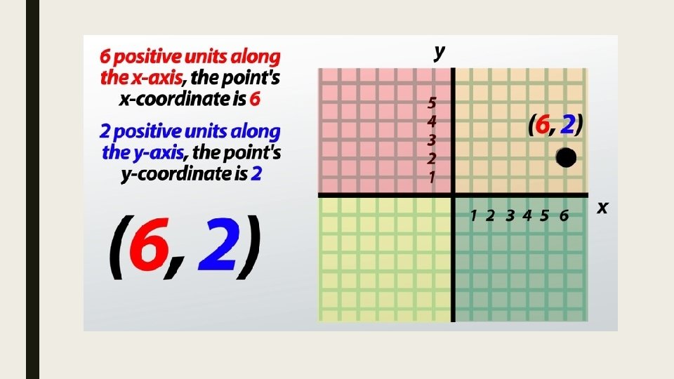 COORDINATE POINTS ■ The coordinates of a point are represented by the ordered pair (x, y) Remember: x comes before y in the alphabet.