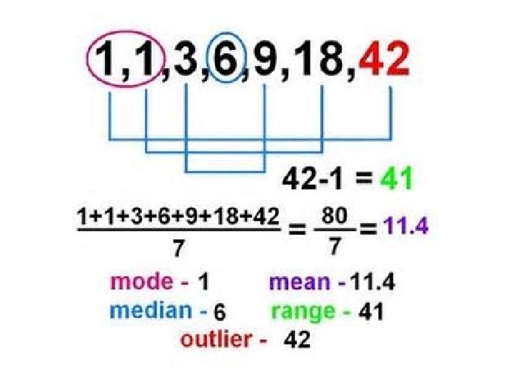 {3, 9, 42, 1, 18, 6, 1} Find the mean. Find the median. Find the mode. Find the range. Find the outlier.