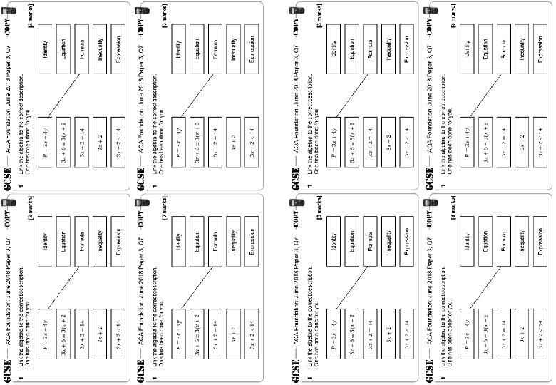 Algebra – Definitions – Foundation – GCSE Questions – AQA These questions are the same format as previous GCSE exams. COPY means they use the exact same numbers as the original GCSE question. Otherwise, they are clone questions using different numbers. The worksheets are provided in 2 sizes.