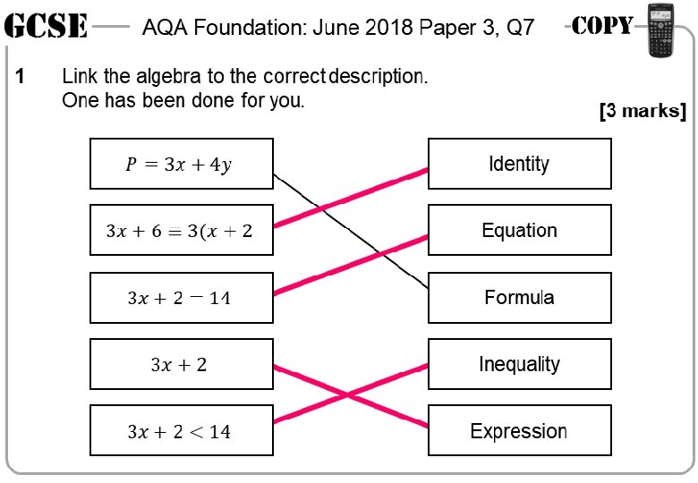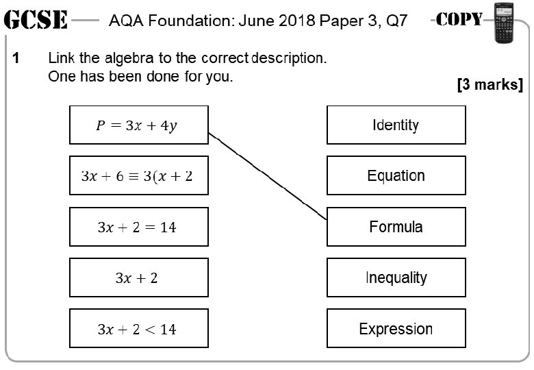 AQA Foundation: June 2018 Paper 3, Q 7 1 Link the algebra to the correct description. One has been done for you. AQA Foundation: June 2018 Paper 3, Q 7 1 [3 marks] Identity Equation Formula Inequality Expression AQA Foundation: June 2018 Paper 3, Q 7 1 Link the algebra to the correct description. One has been done for you. [3 marks] Identity Equation Formula Inequality Expression