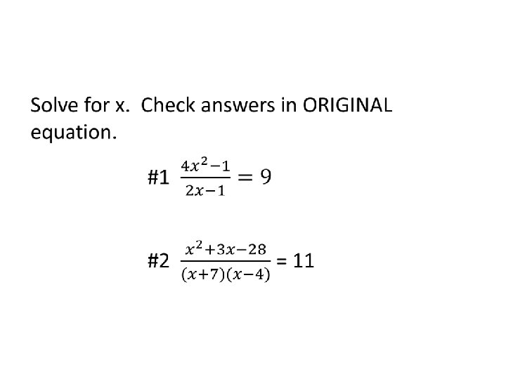 • Solving an equation. • Simplify the fractions in the equation! • When you get your final answer- YOU MUST CHECK IT IN THE ORIGINAL EQUATION! • Any value that results in a denominator of zero is eliminated from the solution set.