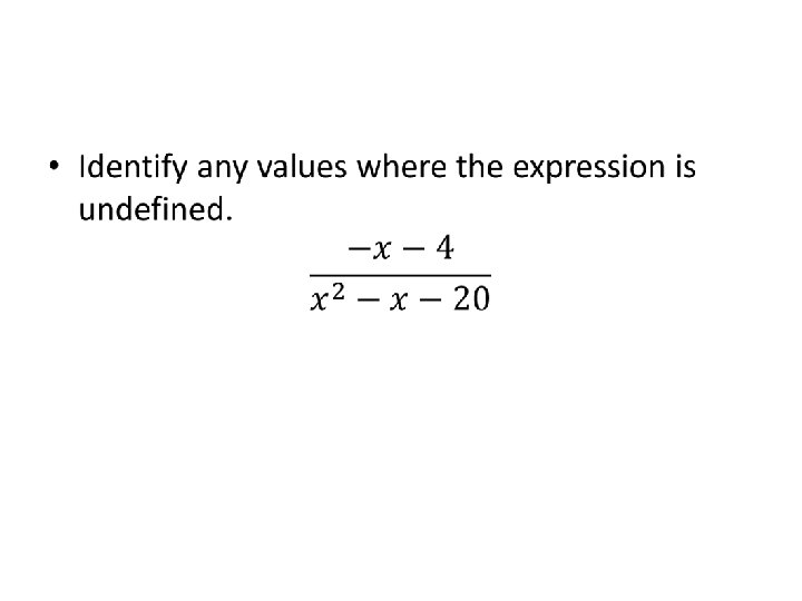 • A rational expression is undefined if a value of x would make the denominator equal zero. • Set a denominator equal to zero to find xvalues where the expression is undefined