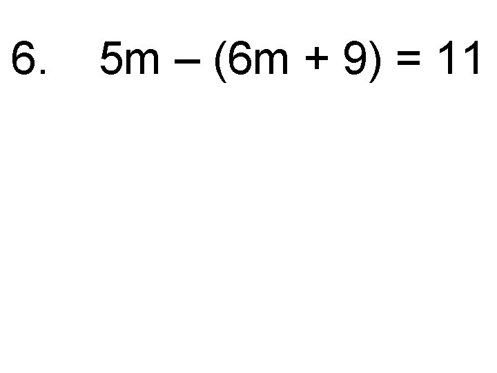 6. 5 m – (6 m + 9) = 11 5 m – 6 m – 9 = 11 -m – 9 = 11 +9 +9 -m = 20 m = -20
