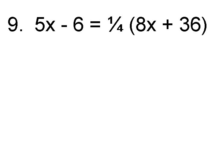 9. 5 x - 6 = ¼ (8 x + 36) 5 x – 6 = 2 x + 9 -2 x 3 x – 6 = 9 +6 +6 3 x = 15 3 3 x=5