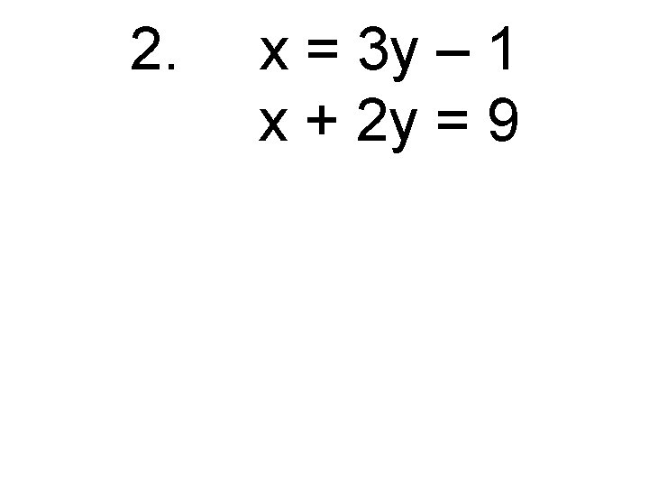 2. x = 3 y – 1 x + 2 y = 9 Substitute 3 y – 1 for x in the 2 nd equation: 3 y – 1 + 2 y = 9 Now solve for y: 5 y – 1 = 9 5 y = 10 y=2 Now substitute y = 2 in the first equation: x = 3(2) – 1 x=5