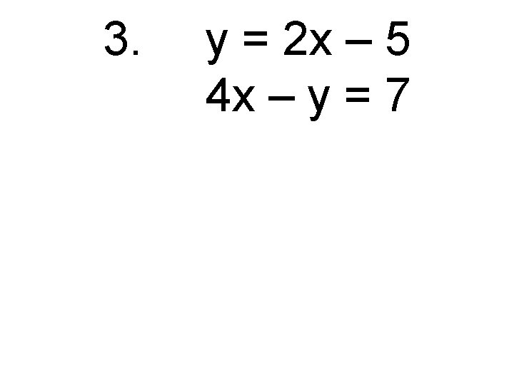 3. y = 2 x – 5 4 x – y = 7 Substitute 2 x – 5 for y in the second equation: 4 x – (2 x – 5) = 7 4 x – 2 x + 5 = 7 2 x = 2 x=1 Now substitute x = 1 in the first equation: y = 2(1) – 5 y = -3