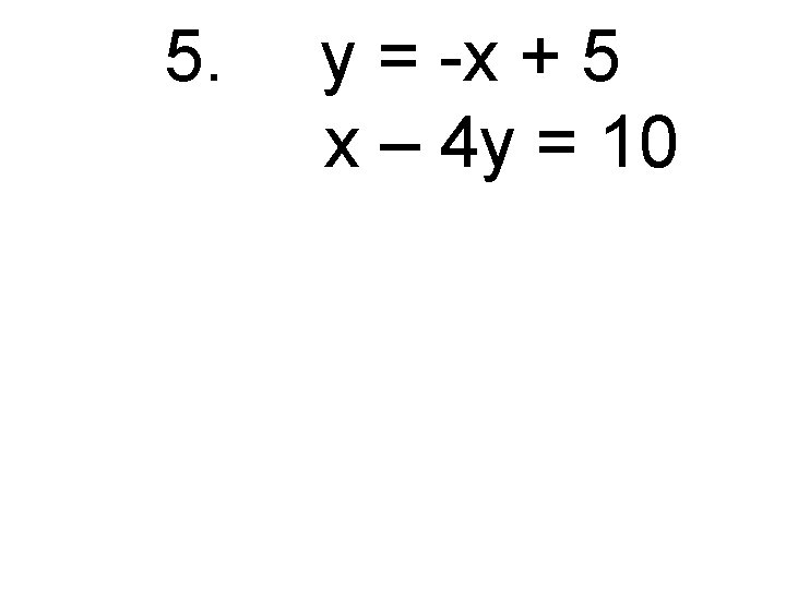 5. y = -x + 5 x – 4 y = 10 Substitute -x + 5 for y in the second equation: x – 4(-x + 5) = 10 x + 4 x – 20 = 10 5 x = 30 x=6 Substitute x = 6 for y in the first equation: y = -6 + 5 y = -1