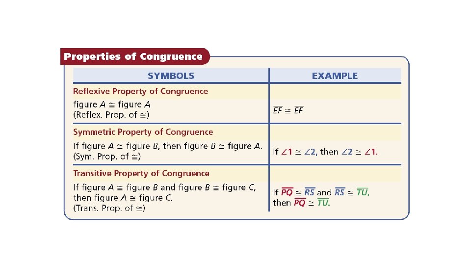 You learned in Chapter 1 that segments with equal lengths are congruent and that angles with equal measures are congruent. So the Reflexive, Symmetric, and Transitive Properties of Equality have corresponding properties of congruence.