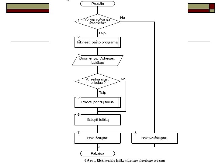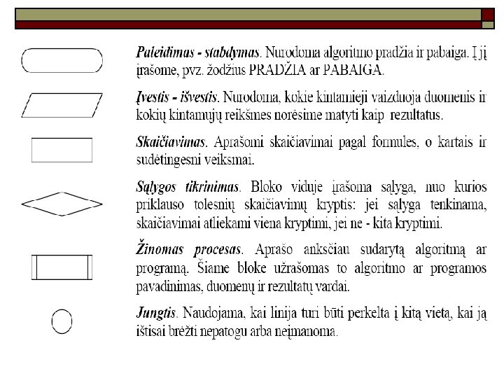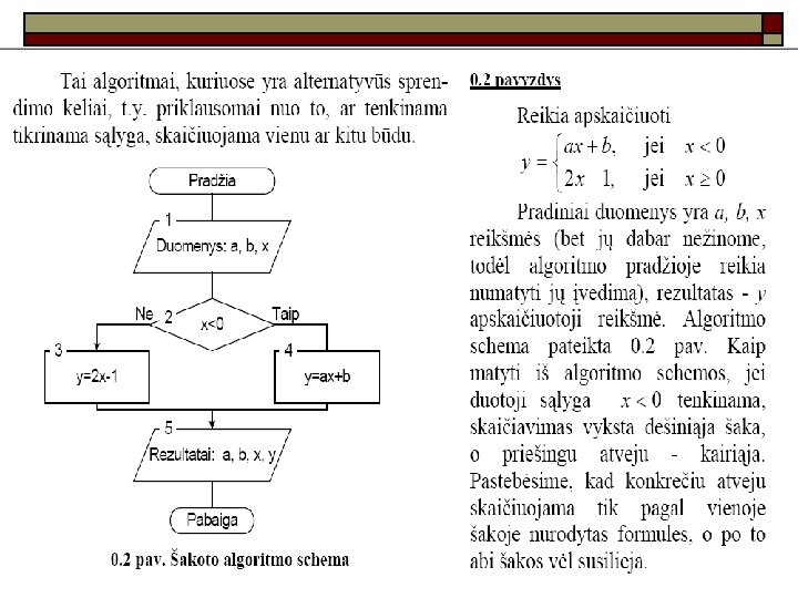 Algoritmo savybės o o o Diskretumas: algoritmas skaidomas į tiksliai aprašytus vykdymo žingsnius. Baigtumas: algoritmas turi turėti pabaigą. Rezultatyvumas: algoritmas visada turi pateikti konkretų rezultatą (jei jis egzistuoja) arba paaiškinimą, kodėl jis negautas. Aiškumas: algoritmas turi būti pateikiamas taip, kad jį visi vienareikšmiškai suprastų. Universalumas: algoritmas turi tikti bet kokiems duomenimis.