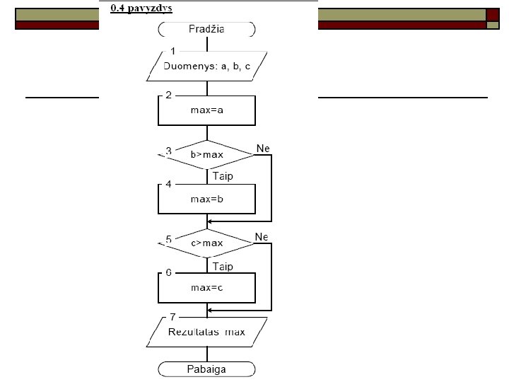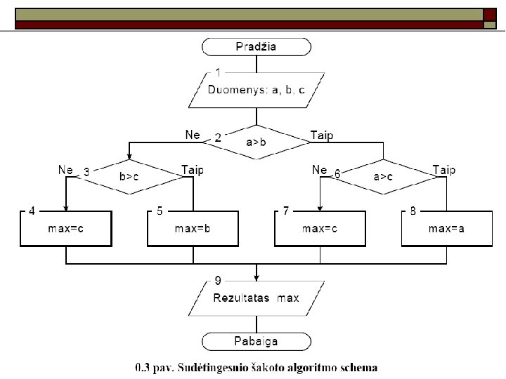 0. 3 pavyzdys Duoti trys nelygūs skaičiai. Reikia surasti didžiausiąjį skaičių (jo reikšmę). Skaičių reikšmių dabar nežinome. Pavadinkime juos a, b, c, o didžiausią reikšmę max. Jei a būtų daugiau už b, tada beliktų a palyginti su c ir didesniąją reikšmę suteiktume kintamajam max. Priešingu atveju reiktų b palyginti su c. o