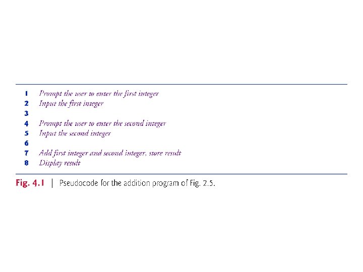 4. 3 Pseudocode Pseudocode (or “fake” code) is an artificial and informal language that helps you develop algorithms. Similar to everyday English Helps you “think out” a program before attempting to write it. Carefully prepared pseudocode can easily be converted to structured portions of C++ programs. Normally describes only executable statements. Declarations (that do not have initializers or do not involve constructor calls) are not executable statements. Fig. 4. 1 corresponds to the algorithm that inputs two integers from the user, adds these integers and displays their sum. © 1992 -2017 by Pearson Education, Inc. All Rights Reserved.