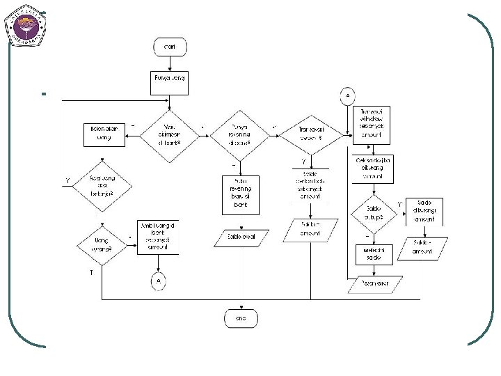Pembuatan Flowchart l l l Tidak ada kaidah yang baku. Flowchart = gambaran hasil analisa suatu masalah Flowchart dapat bervariasi antara satu pemrogram dengan pemrogram lainnya. Hindari pengulangan proses yang tidak perlu dan logika yang berbelit sehingga jalannya proses menjadi singkat. Jalannya proses digambarkan dari atas ke bawah dan diberikan tanda panah untuk memperjelas.