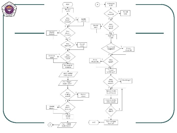Flowchart l l l Bagan-bagan yang mempunyai arus yang menggambarkan langkah-langkah penyelesaian suatu masalah. Merupakan cara penyajian dari suatu algoritma. Ada 2 macam Flowchart : – System Flowchart urutan proses dalam system dengan menunjukkan alat media input, output serta jenis media penyimpanan dalam proses pengolahan data. – Program Flowchart urutan instruksi yang digambarkan dengan symbol tertentu untuk memecahkan masalah dalam suatu program.