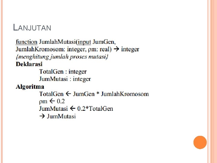 LANJUTAN Untuk memilih posisi gen yang mengalami mutasi dilakukan dengan membangkitkan bilangan acak antara 1 – Panjang total gen yaitu 124. Misal kita tentukan ρm = 20 %. Maka jumlah gen yang akan dimutasi adalah = 0, 2*24 = 4, 8 =5