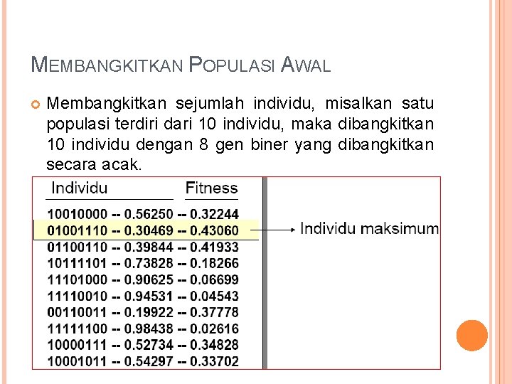 DEFINISI INDIVIDU � Dari gambar terlihat bahwa penyelesaian berada pada nilai 0<x<1. Jadi dengan menggunakan 8 bit biner didefinisikan: � Individu dinyatakan dalam 8 gen biner, dengan batas 0 sampai dengan 1, berarti 1 bit setara dengan 2 -8. Sebagaicontoh: � 10001001 = (128+8+1)/256 = 0. 5352 � 00110100 = (4+16+32)/256 = 0. 2031 � 01010010 = (2+16+64)/256 = 0. 3203