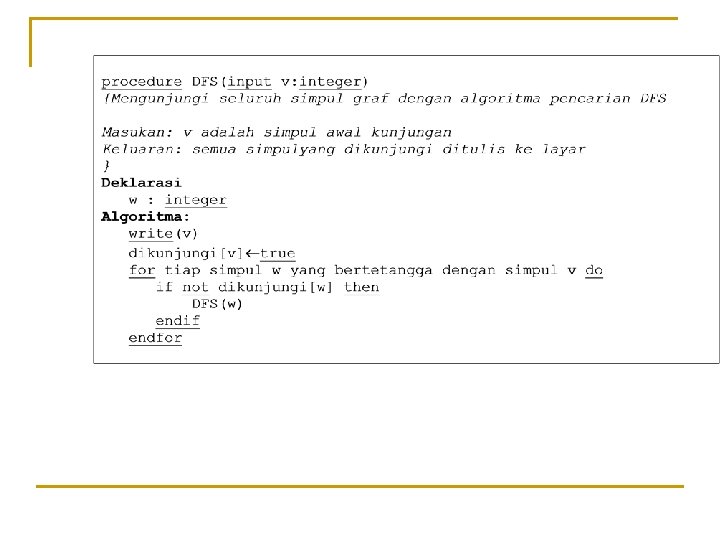 ![3. Tabel boolean yang bernama dikunjungi : array[l. . n] of boolean dikunjungi[i] = 3. Tabel boolean yang bernama dikunjungi : array[l. . n] of boolean dikunjungi[i] =](https://slidetodoc.com/presentation_image/512b7105f5c2104711397fdae8c2de1b/image-7.jpg)