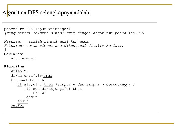 Metode Pencarian Mendalam (DFS) n n Traversal dimulai dari simpul v. Algoritma: 1. 2. 3. Kunjungi simpul v, Kunjungi simpul w yang bertetangga dengan simpul v. Ulangi DFS mulai dari simpul w.