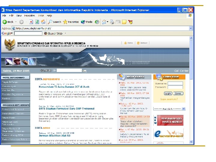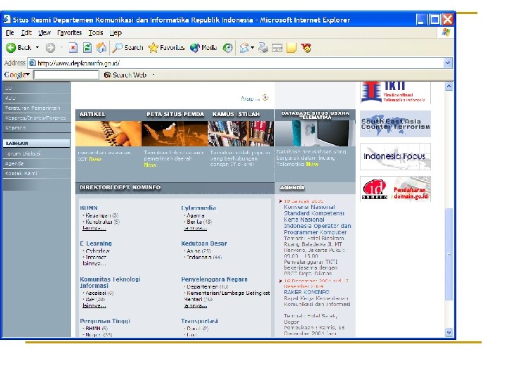 Aplikasi DFS dan BFS 1. Search Engine (google, yahoo, altavista) Komponen search engine: 1. Spider : program penjelajah web (web surfer) 2. Index: basisdata yang menyimpan kata-kata penting pada setiap halaman web 3. Query: pencarian berdasarkan string yang dimasukkan oleh pengguna (end- user) Secara periodik (setiap jam atau setiap hari), spider menjejalahi internet untuk mengunjungi halaman-halaman web, mengambil kata-kata penting di dalam web, dan menyimpannya di dalam index. Query dilakukan terhadap index, bukan terhadap website yang aktual.