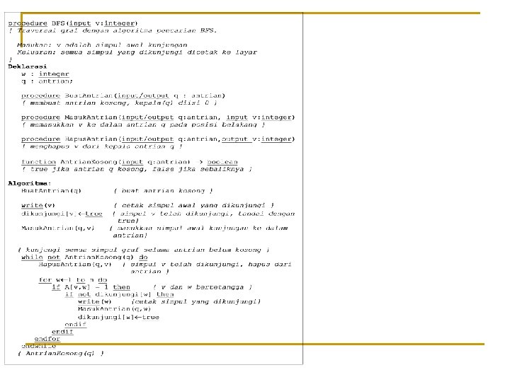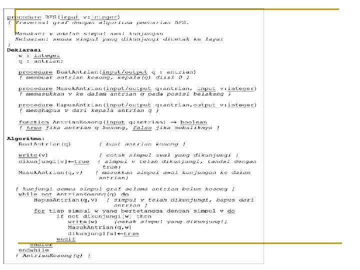 n n Pseudo-code algoritma: Diperlukan: 1. Matriks ketetanggaan A = [aij] yang berukuran n n, aij = 1, jika simpul i dan simpul j bertetangga, aij = 0, jika simpul i dan simpul j tidak bertetangga. 2. Antrian q untuk menyimpan simpul yang telah dikunjungi.