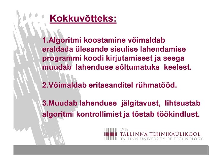 Näited 2. Ülesanne: võida lotomängus miljoni Eeskiri, mis eisaa olla algoritm: osta pilet ja osale, kuni võidad. Eeskiri, mis saaks olla algoritm: puudub. 3. Ülesanne: vaheta 100 eurot väiksemateks rahadeks Eeskiri, mis saab olla algoritm, eeldab sellise ülesande puhul püstituse täpsustusi. Peame selgitama, mis tähendab “väiksemateks”, milliseid rahatähti ja kui palju saame kasutada. Juhul kui ülesande püstitaja seda pole teinud, peame kitsendused seadma ise ja neid arvestades koostama algoritmi. .
