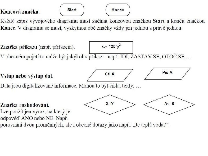 Vývojové diagramy: • Vývojový diagram je grafické znázornění algoritmu. • Vývojové diagramy se skládají z grafických značek. Značky jsou různé a různě se kombinují, tím se simulují různé situace a různé příkazy, do těchto značek se pak vypisují upřesňující údaje. Takto vypadají jednotlivé části vývojového diagramu.