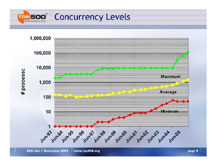 Análisis de los reportes TOP 500 n Crecimiento anual de performance cerca de 1. 82 n Dos factores contribuyen casi en par en este crecimiento n Número de procesadores crece anualmente por un factor de 1. 30, y n Performance de un procesador crece en 1. 40 vs. 1. 58 según la Ley de Moore 1. 3 x 1. 4 = 1. 82