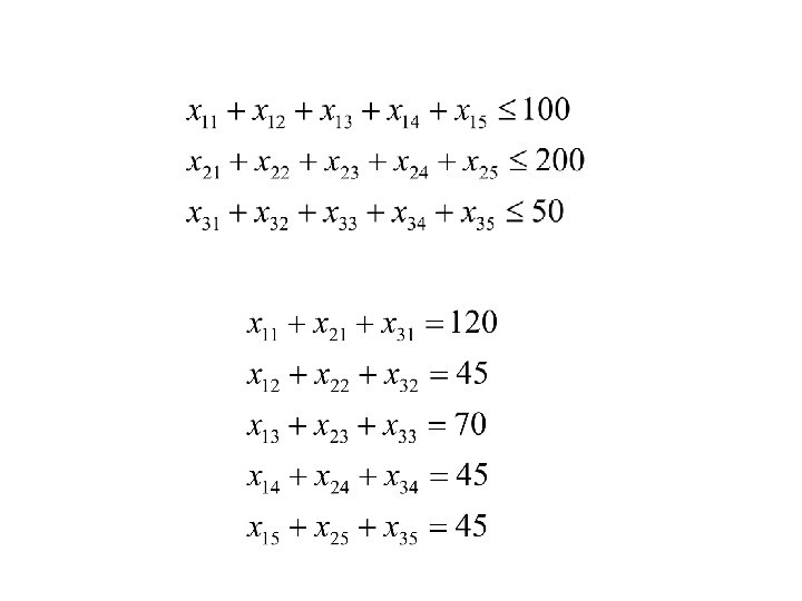 Budowa modelu E 1 E 2 E 3 E 4 E 5 ZP K 1 ? ? ? 100 K 2 ? ? ? 200 K 3 ? ? ? 50 Zap. 120 45 70 45 45 xij – rozmiar dostaw z kopalni Ki do elektrociepłowni Ej