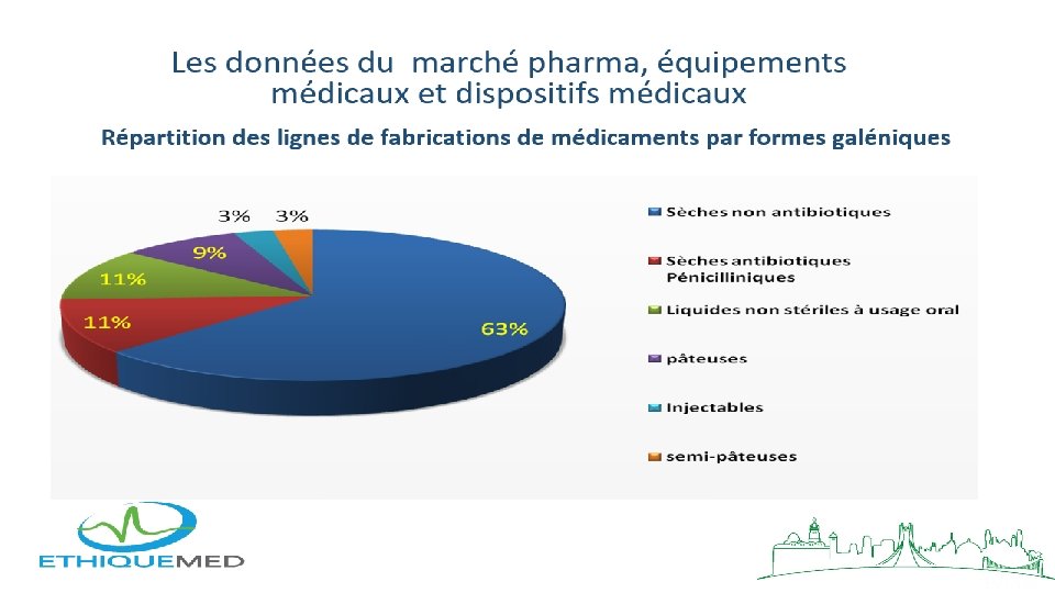 Les Données du marché pharma & Equipment médicaux et des dispositifs médicaux Répartition des établissements de soins privés par type de structure Les infrastructures privées de soins occupent maintenant une place importante dans le secteur de la santé. Ces infrastructures se répartissent comme suit : • 28 cliniques médicales ; • 249 cliniques médico-chirurgicales ; • 36 cliniques de diagnostic ; • 151 centres d‘hémodialyse avec 1 780 reins disponibles ; • 709 cabinets de groupe ; • 9 042 cabinets de spécialistes ; • 7 298 cabinets de généralistes ; • 6 514 cabinets de chirurgie dentaire ; • Et 10 260 officines pharmaceutiques.